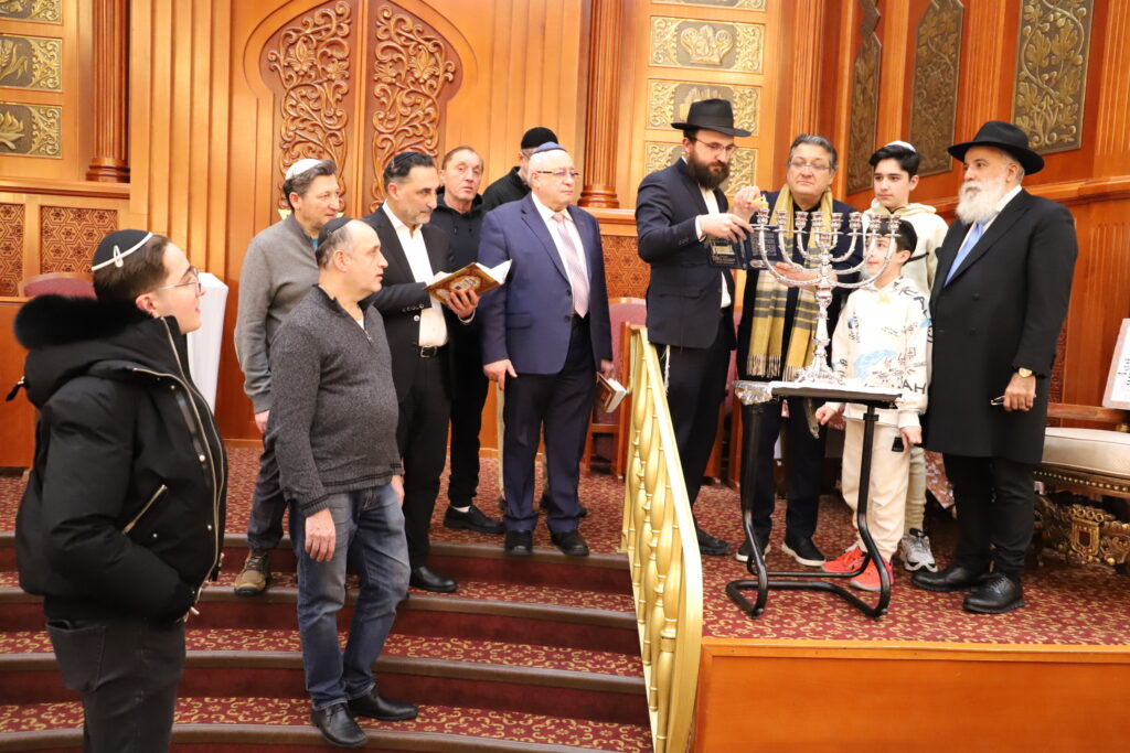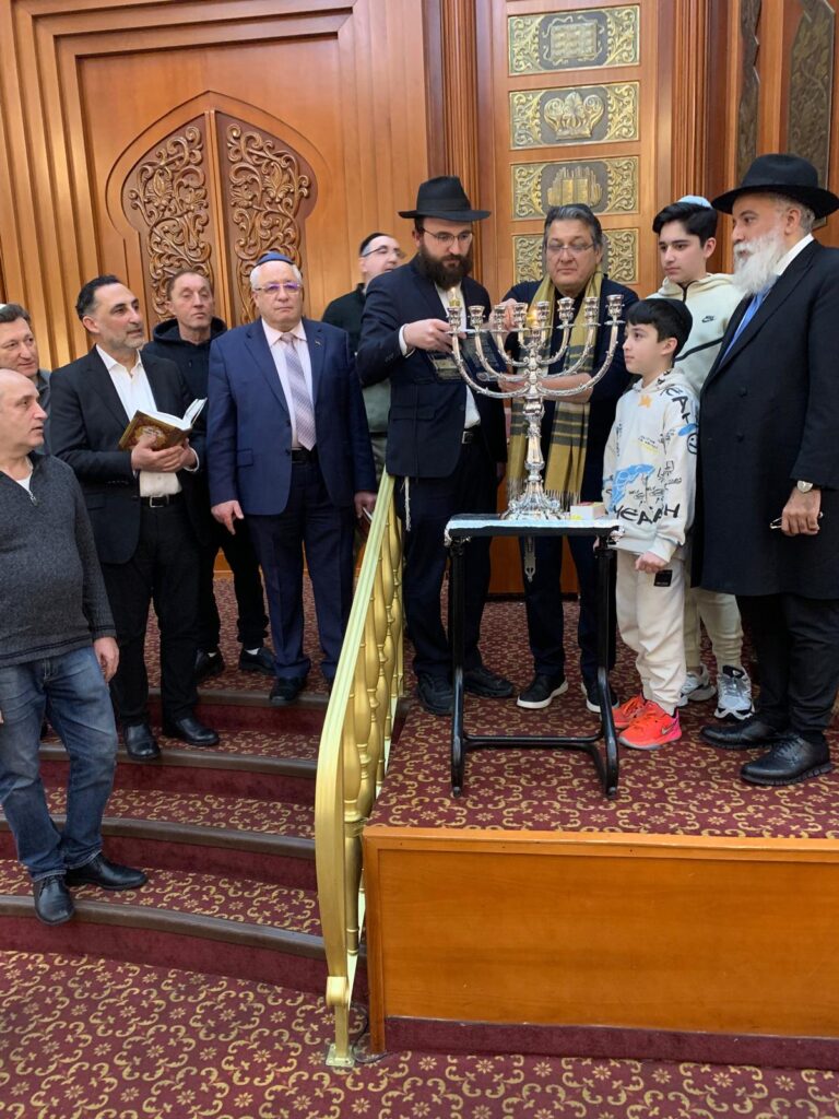 В нашем центре бухарских евреев в первый день Хануки в главной синагоге — Канесои Калон под руководством раббая молодёжного миньяна центра бухарских евреев Ашера Вакнина зажёг свечу меноры Абуля Мушибаев — сын Иосифа Мушибаева, бывшего члена нашей общины. Он сорок лет тому назад купил за свои деньги эту менору и подарил Канесои Калон. Раббай Ашер Вакнин, который руководит молодёжным миньяном, в этот день сам зажёг свечу меноры с прихожанами своего миньяна.
