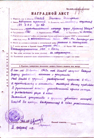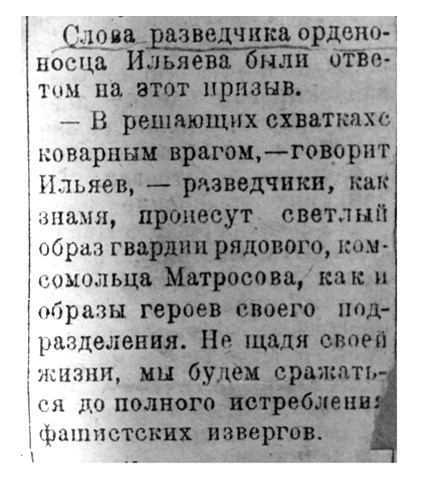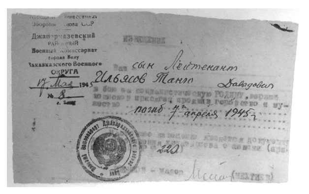 – Когда объявили о наступлении Великой Отечественной войны, Ильяев начал свою службу в Тюменском пехотном училище. Получил звание младшего лейтенанта, был командиром роты автоматчиков, старшим сержантом, а до Берлина дошёл в звании лейтенанта. Продолжал служить в 120-й стрелковой дивизии, которая принимала участие в снятии блокады Ленинграда, с внешней стороны кольца окружения. Как и многие его сослуживцы, был награждён медалью “За оборону Ленинграда”. 5 июля Ильяев получил удостоверение об участии в героической обороне Ленинграда. Дважды, за годы ратной службы, дядя удостаивался ордена Красной Звезды, в феврале 1943-го и в январе 1945-го года. О его подвигах писала фронтовая газета “За Родину”: “В решающей схватке с коварным врагом, Герой Ильяев не только бесстрашно воевал, но ещё и умело вёл за собой своих подчинённых, поднимал боевой дух красноармейцев”.