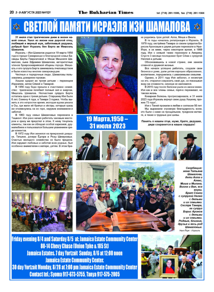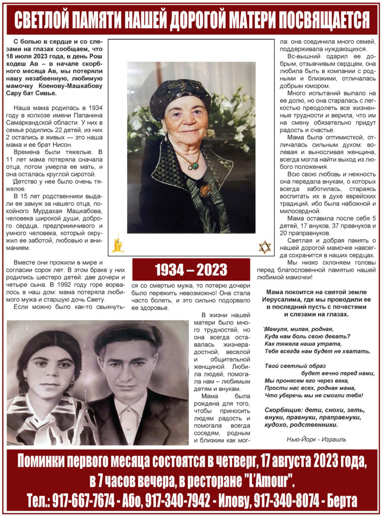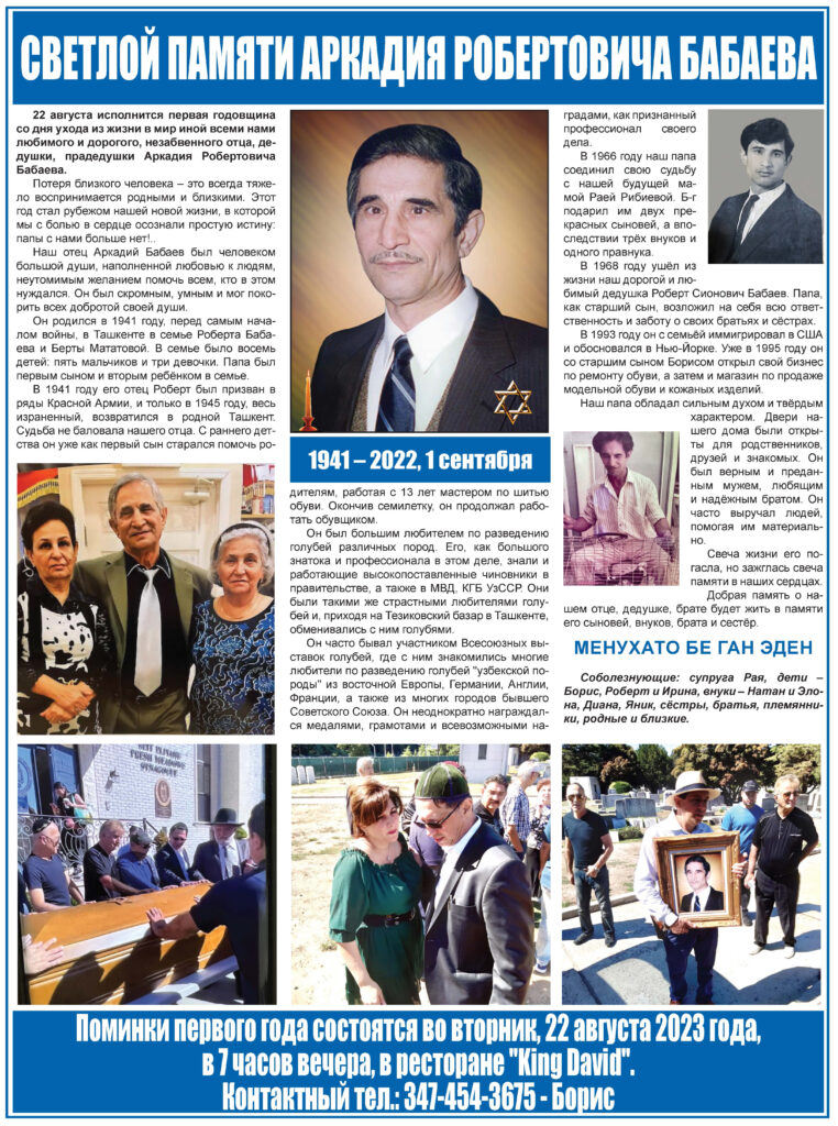 Леви Леваев: Воздадим должное деяниям наших предков! Дорогие друзья!Уважаемый президент Благотворительного фонда «Самарканд» Мошиях Марик Калонтаров!Дамы и господа!Позвольте мне всех вас поздравить от имени Всемирного конгресса бухарских евреев с этой прекрасной инициативой: собраться в великом и родном для всех нас Самарканде, где будут проходить торжественные мероприятия, посвященные важным датам в истории бухарскоеврейского народа.Это 145-летие со […]