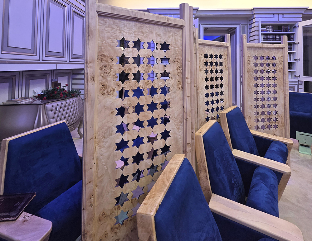 Красивый потолок разрисован шестиконечными звездами на фоне синего неба Израиля. Чудесный арон хакодеш с оригинальными дверцами, с двумя свитками Торы – один в позолоченном футляре, а другой без.